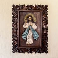"Having risen from the dead, Jesus is depicted in this majestic relief panel from Guatemala. Chico Mendoza hand-carves this relief from pinewood, depicting Jesus with pink and blue painted robes within a frame of elegant floral patterns."