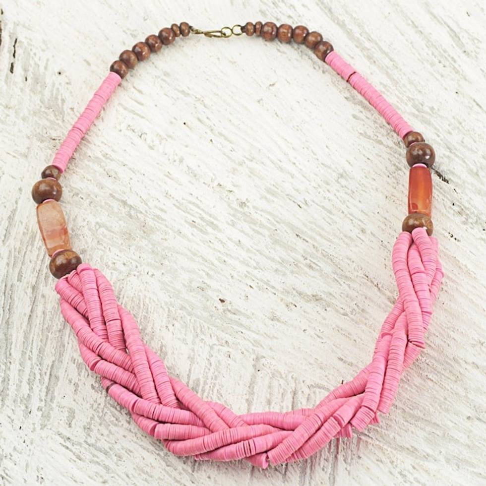 Handcrafted Pink Braided Bead Necklace with Wood and Agate 'Sosongo in Pink' Item ID: 2671800884