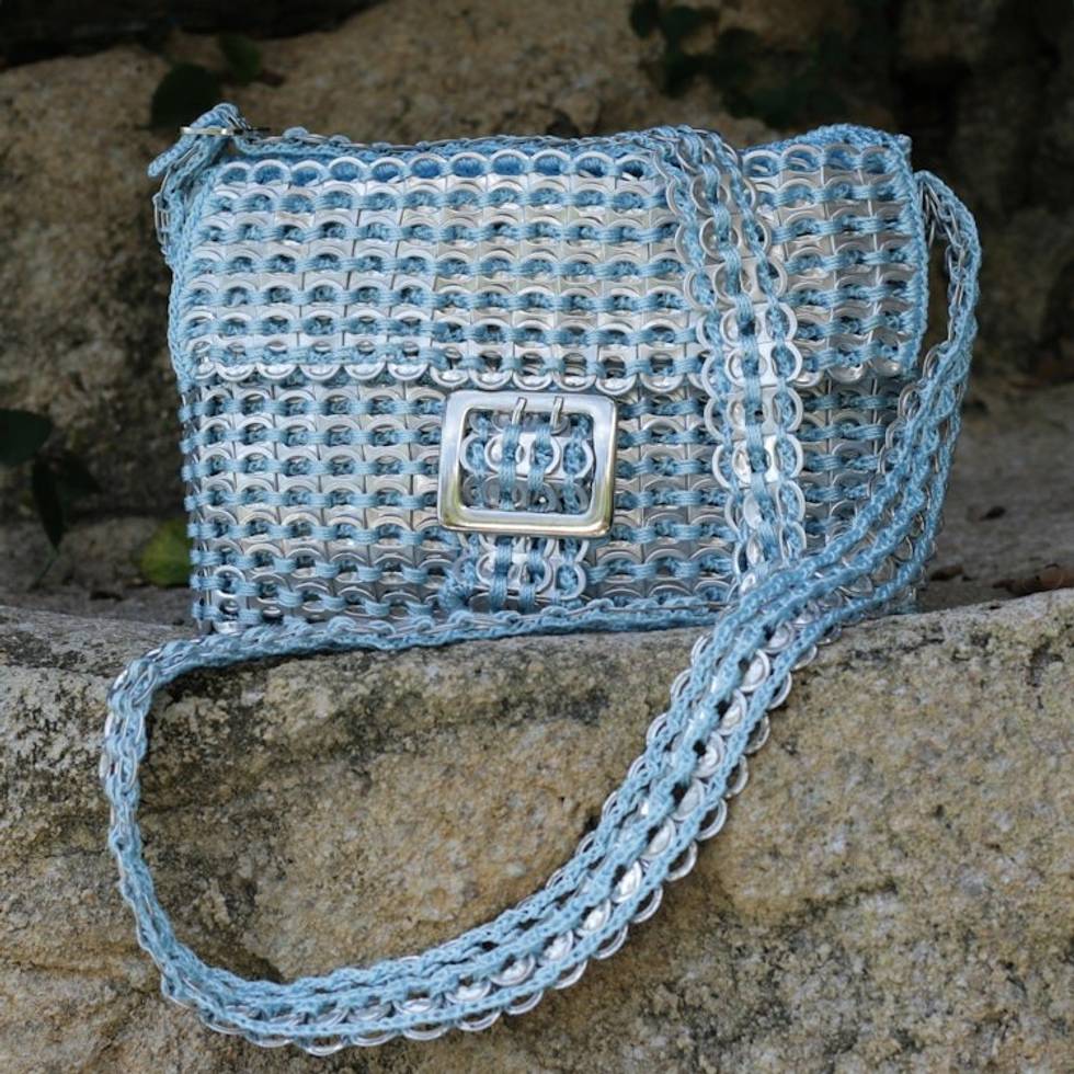 Handcrafted Recycled Aluminum Flap Handbag 'Silver Blue Success' Item ID: 2669887521