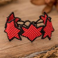 "A tribute to the stars, this stylish wristband bracelet features a dynamic pattern crafted from tiny glass beads in vivid red and black hues. The precise beadwork creates a geometric brilliance that draws attention with every movement. Adjustable with a crystal bead button, it offers a perfect fit for any wrist. Created by the Artisans of Panabaj in Guatemala, this bracelet is a wearable piece of handcrafted art."