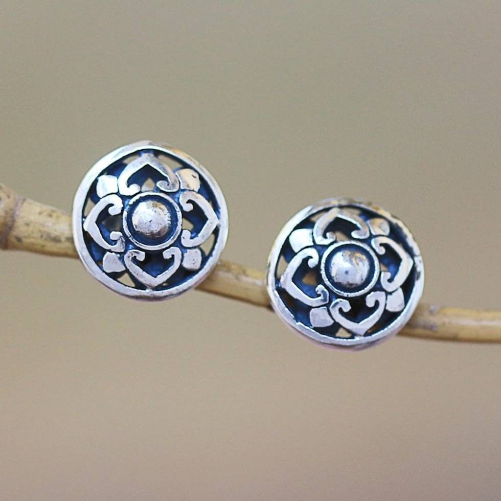 Handcrafted Round Sterling Silver Lotus Flower Stud Earrings 'Lotus Kingdom' Item ID: 2671821630