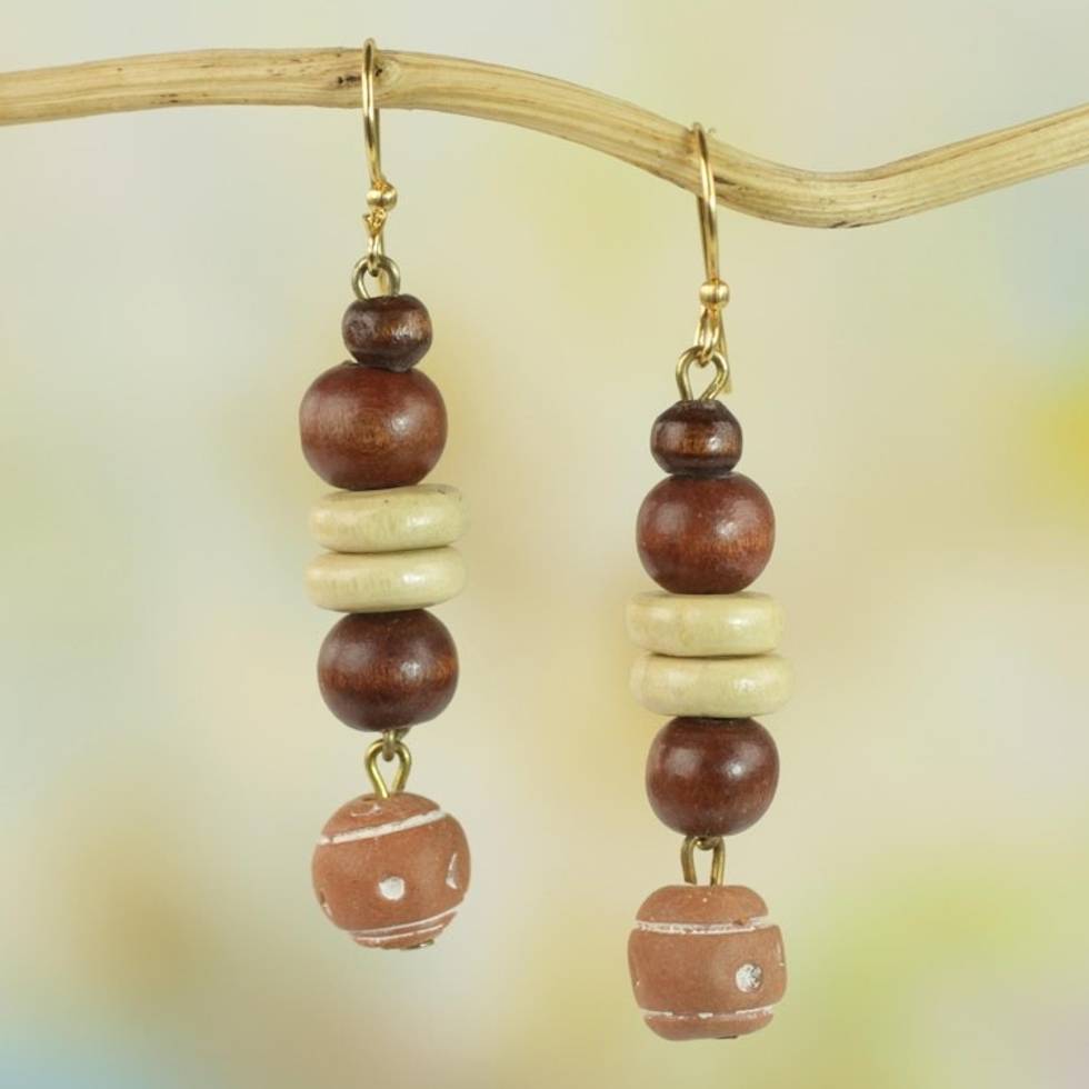 Handcrafted Sese Wood and Ceramic Earrings from Ghana 'Remembrance Beads' Item ID: 2671803658
