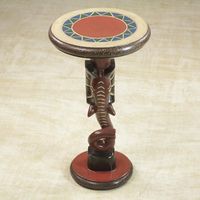 "This round accent table features a design by Ghanaian artisan Raphat Asigbey. He works with cedar wood to craft the table, hand-carving the leg to feature the image of an elephant that curls its trunk. A red, hand-painted design completes this impressive piece of furniture."