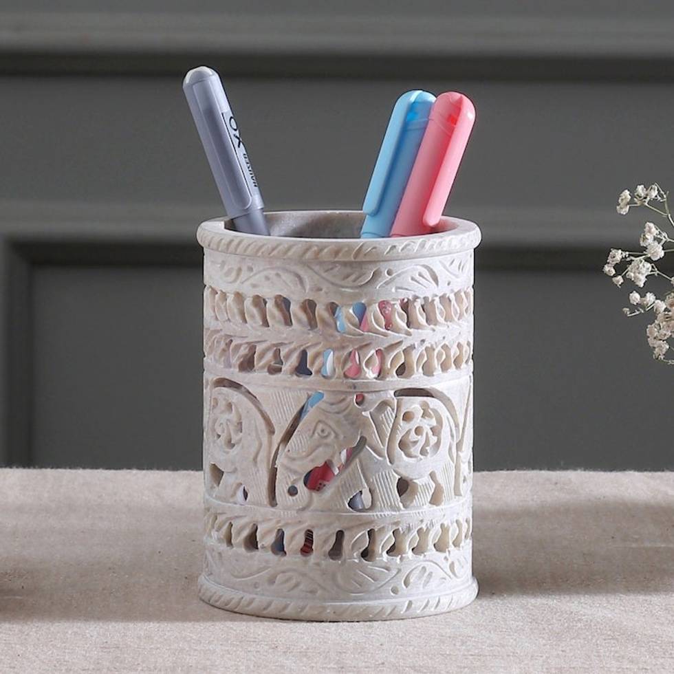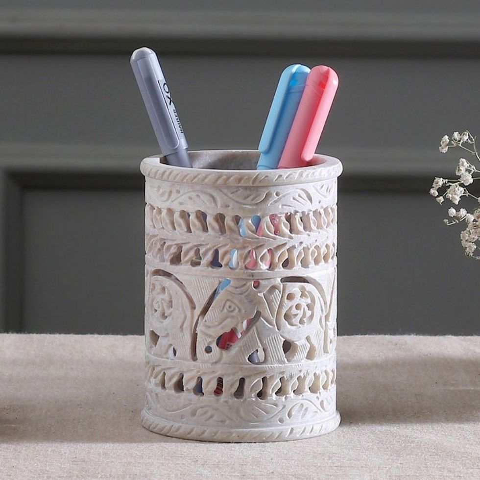 Handcrafted Soapstone Pencil Holder with Elephant Motifs 'Helping Elephant' Item ID: 2671787718