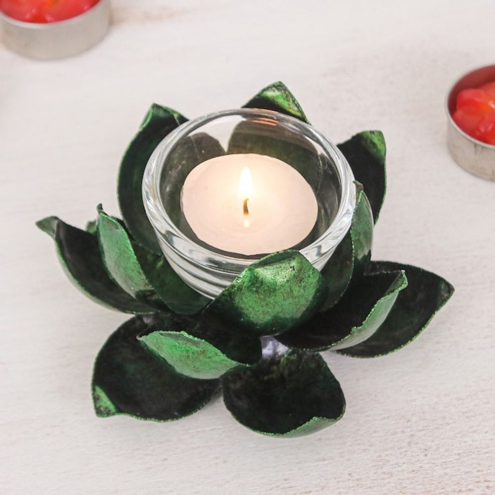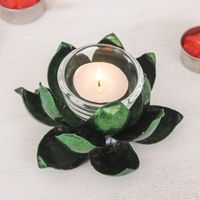 Handcrafted Steel Lotus Flower Tealight Holder in Green 'Precious Lotus in Green' Item ID: 2671797923