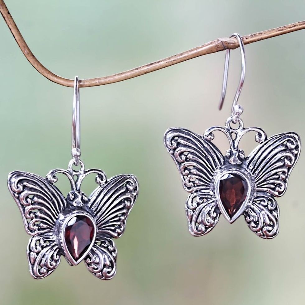 Handcrafted Sterling Silver and Garnet Butterfly Earrings 'Enchanted Butterfly' Item ID: 2671702027