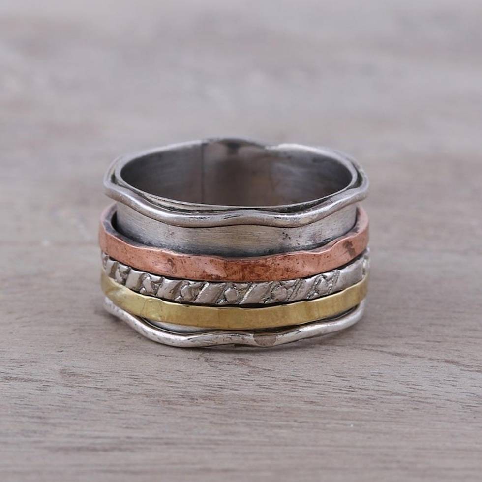 Handcrafted Sterling Silver Copper and Brass Meditation Ring 'Spinning Trio' Item ID: 2669923975