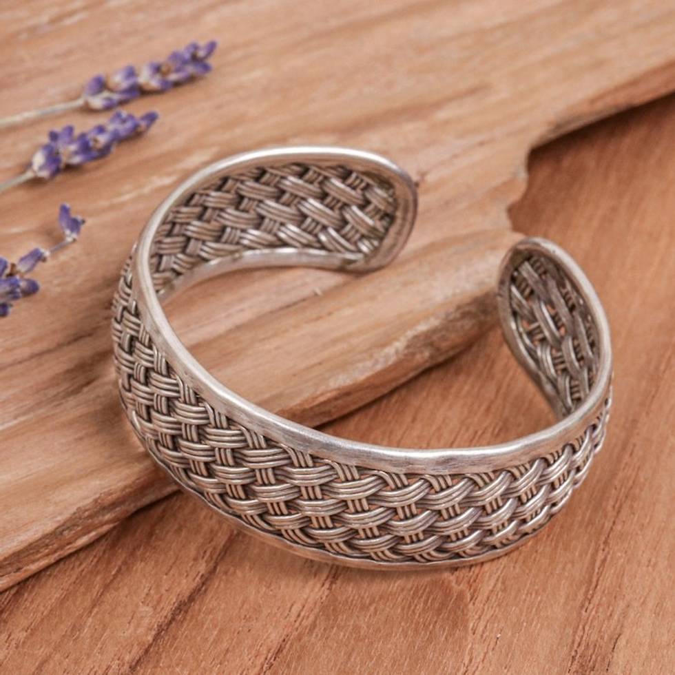 Handcrafted Sterling Silver Cuff Bracelet from Thailand 'Tight Weave' Item ID: 2671800997