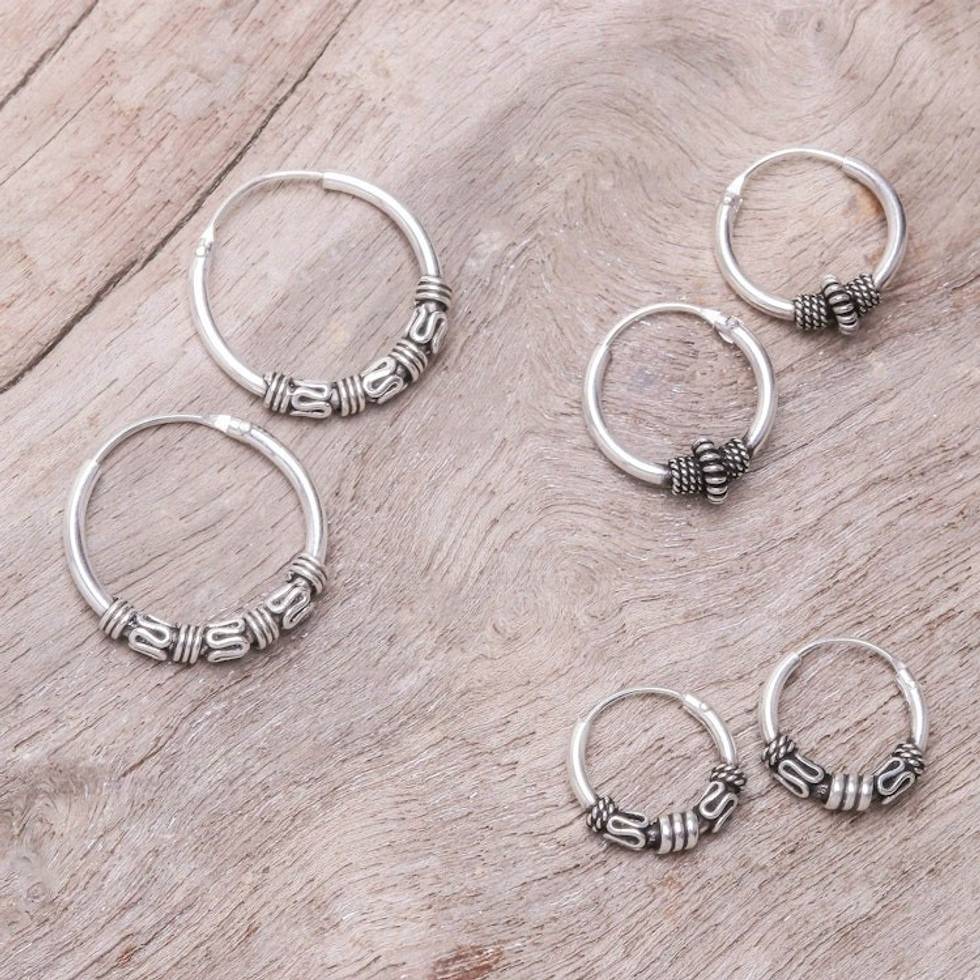 Handcrafted Sterling Silver Hoop Earrings Set of 3 'Thai Intricacy' Item ID: 2669928119