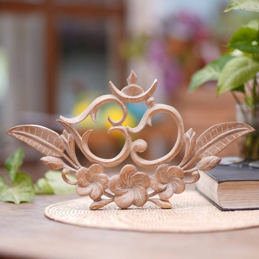 Handcrafted Suar Wood Floral Leafy Om Relief Panel from Bali 'Verdant Om' Item ID: 2671733534