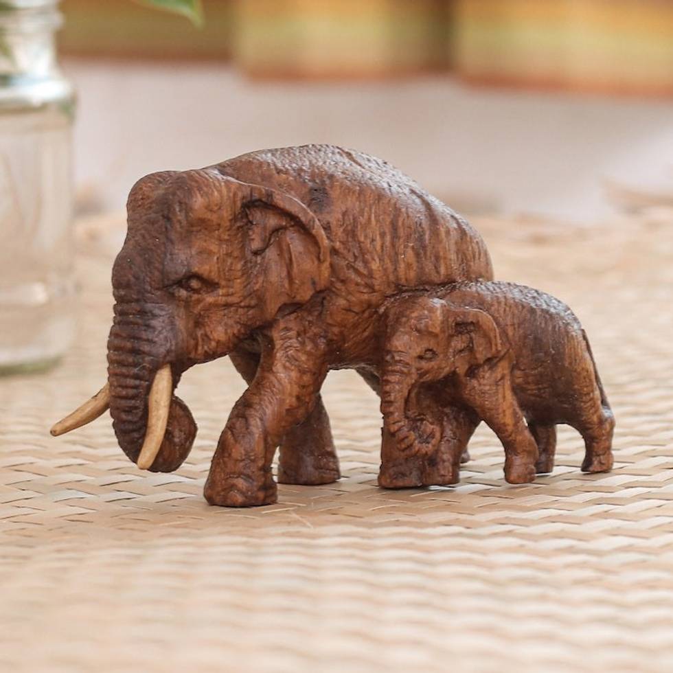Handcrafted Teak Wood Elephant Statuette from Thailand 'Mom and Me' Item ID: 2671641255
