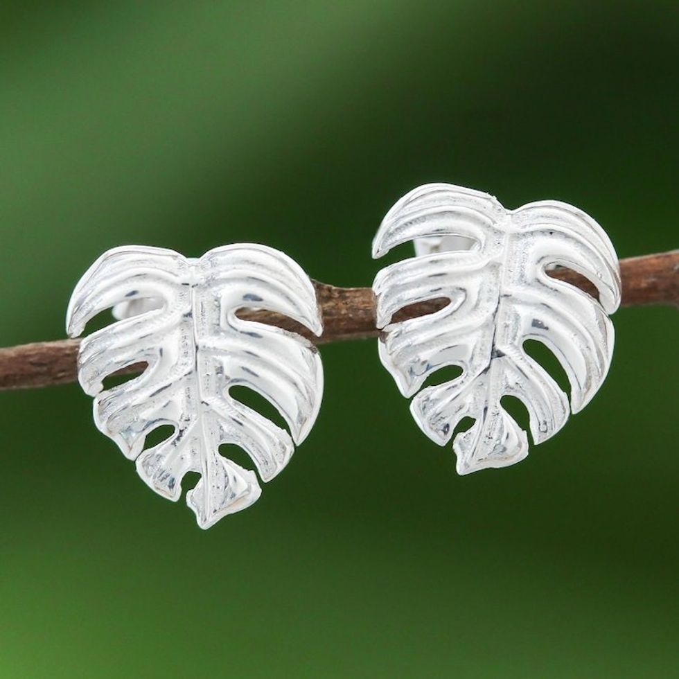 Handcrafted Thai Sterling Silver Leaf Stud Earrings 'Tropical Leaf' Item ID: 2671640897