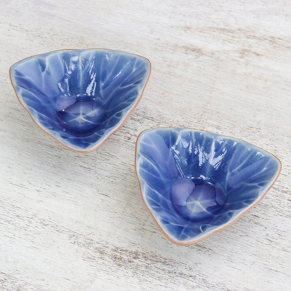 Handcrafted Triangular Blue Ceramic Condiment Servers Pair 'Luxe Leaves in Blue' Item ID: 2671798605