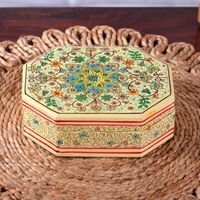 "Lined with velvet, this petite decorative box has a design that was inspired by Persian carpets. Niyaz from India creates the box from kail wood, covering it with papier mache before painting it meticulously by hand with poster paints and pigments derived from natural flowers."