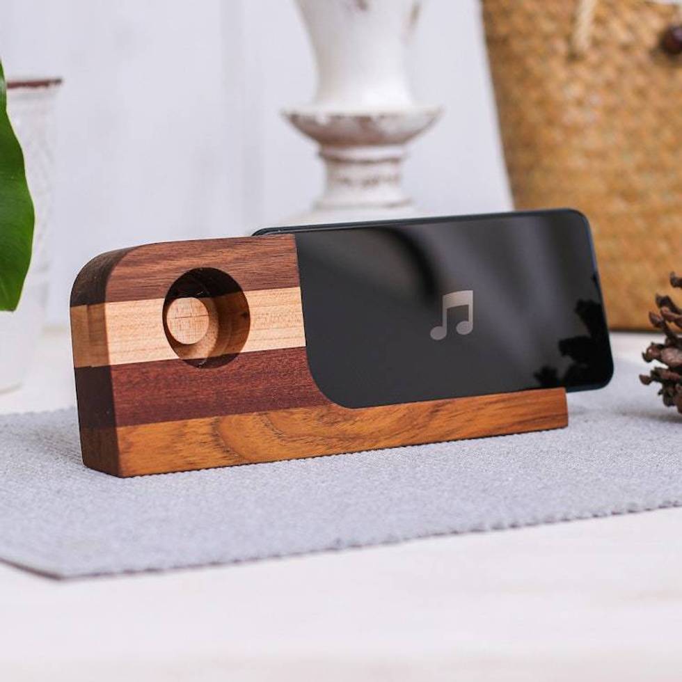 Handcrafted Wood Smartphone Speaker with Brown Stripes 'Wooden Sounds' Item ID: 2676647638