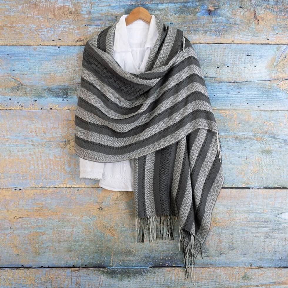 Handloomed Baby Alpaca Blend Striped Shawl in Black and Grey 'Classic Shades' Item ID: 2669891281