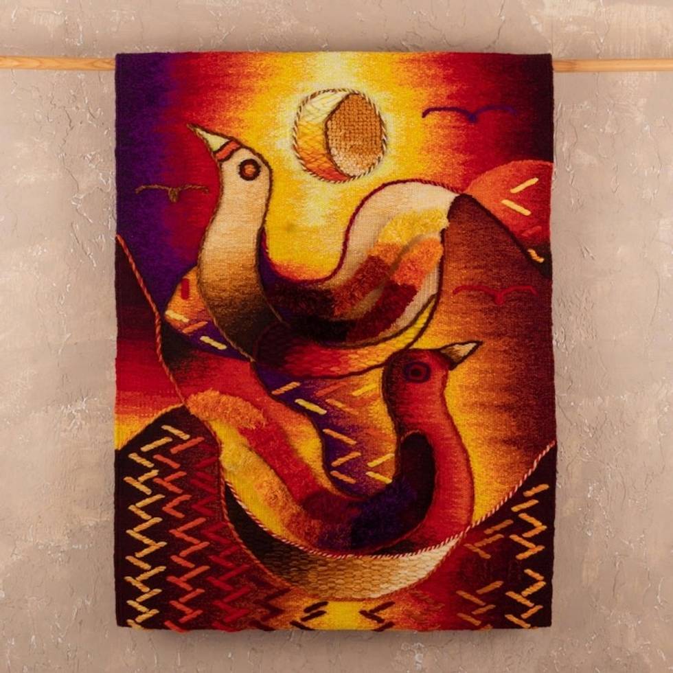 "Peruvian artisan Inka combines traditional weaving techniques with modern design in the creation of this gorgeous tapestry. Featuring a rich variety of textures, the alpaca blend tapestry depicts a pair of Andean birds in deep sunset hues"