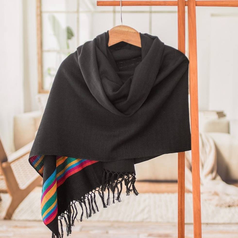 Handloomed Black Cotton Shawl with Colorful Stripes 'Festive Twilight' Item ID: 2671626801