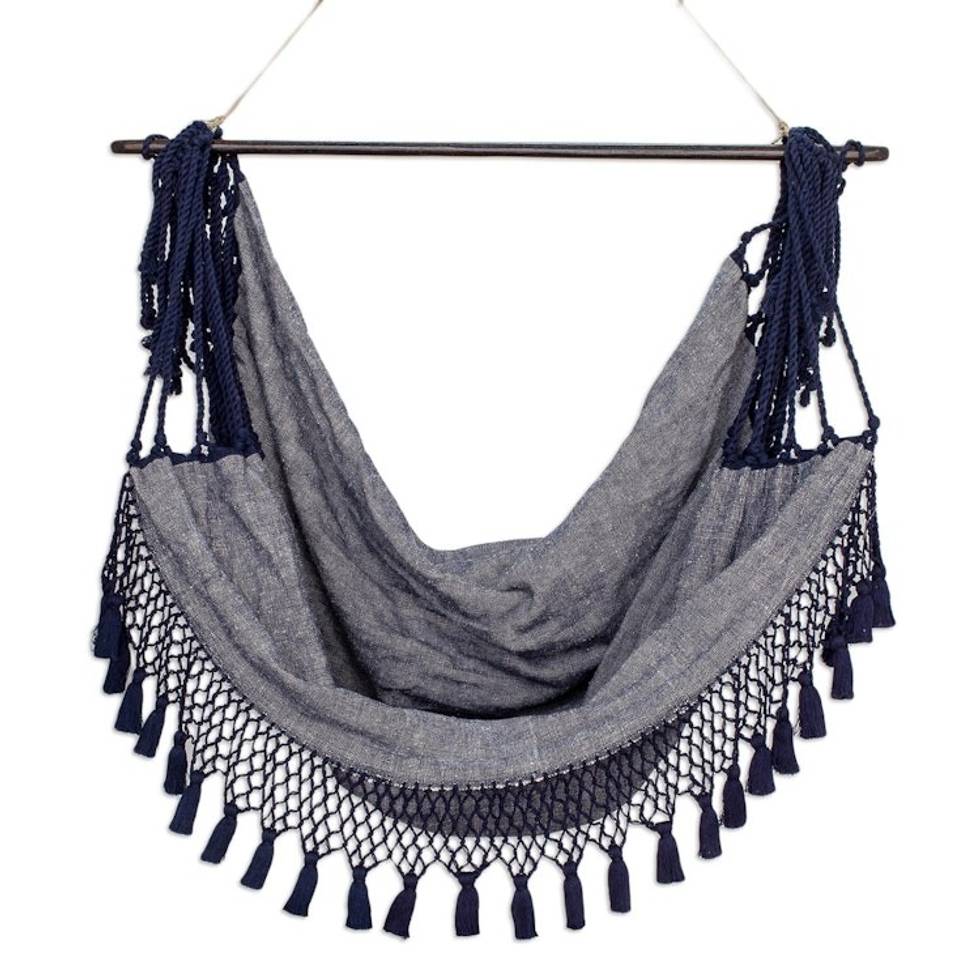 "Imagine yourself under a starlit sky as you relax in this gorgeous hammock chair from Estuardo Cofino in Guatemala. Woven from 100% cotton on a traditional loom, the hammock chair features midnight blue tasseled trim and a pinewood bar."
