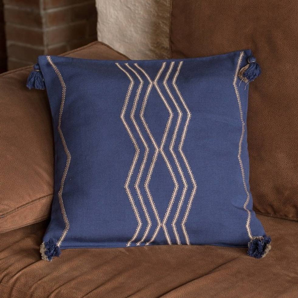 "Local artisans handloom a lovely creation from cotton, using a palette of indigo and beige hues and following the design of Guatemala's Miriam and Debora. Drawing inspiration from geometric motifs, the duo creates this modern cushion cover with little tassels and a convenient opening at the back."