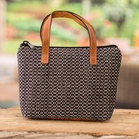 Handloomed Leather-Accented Onyx and White Cotton Handbag 'Onyx Time' Item ID: 2671770985