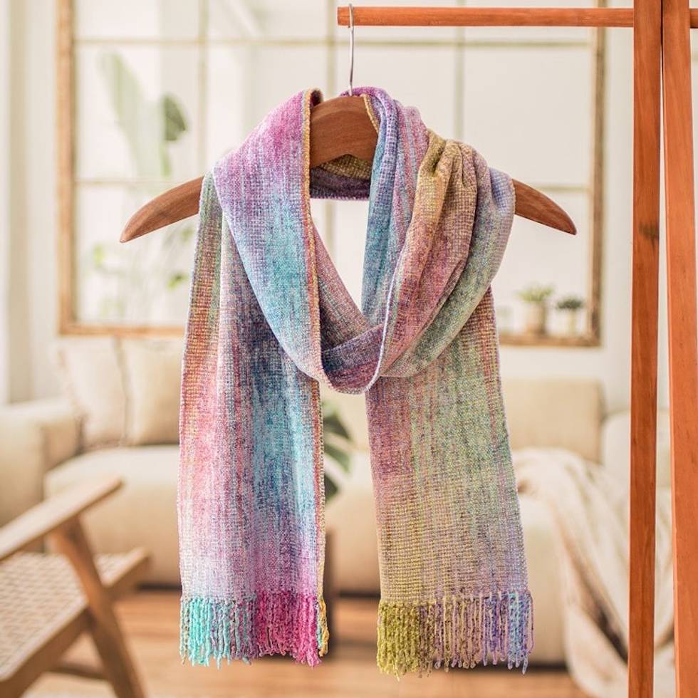Handloomed Pastel-Toned Rayon Chenille Scarf with Fringes 'Pastel Dream' Item ID: 2671769043