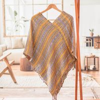Handloomed Striped Fringed Cotton Poncho Woven in Guatemala 'Path to Joy' Item ID: 2671627051