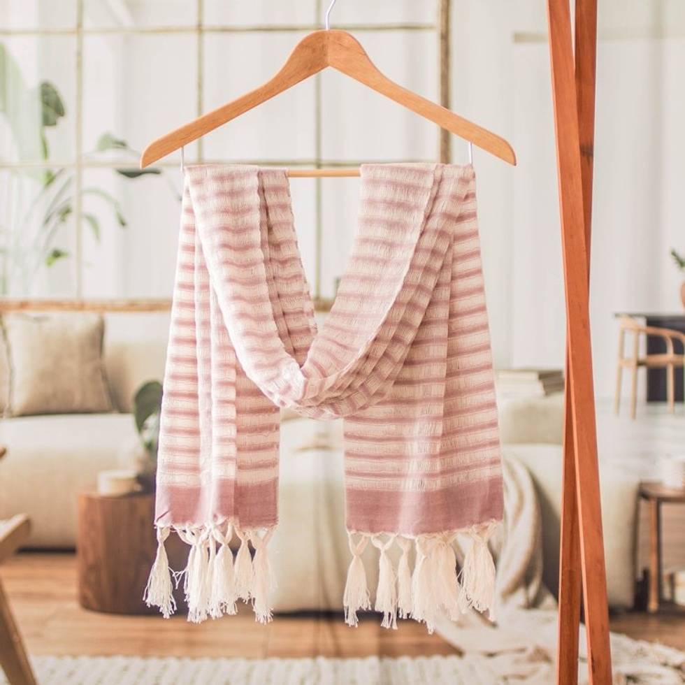 Handloomed Striped Fringed Cotton Scarf in Ivory and Pink 'Weaving Glamour' Item ID: 2671769196