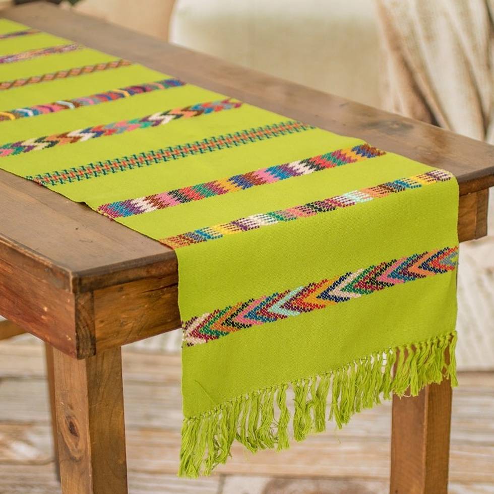 Handloomed Striped Green Cotton Table Runner with Fringes 'Route to the Forest' Item ID: 2671769124