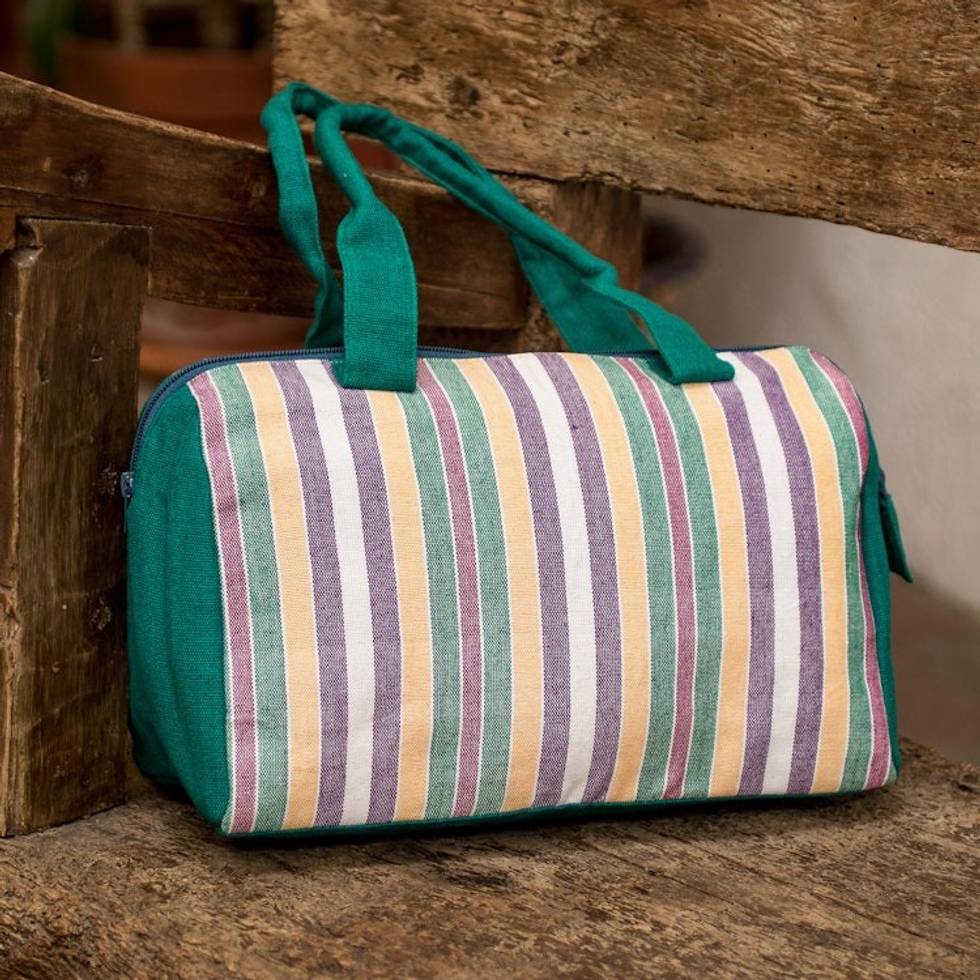 Handloomed Striped Viridian Cotton Handbag with Zipper 'Viridian Joy' Item ID: 2671769762
