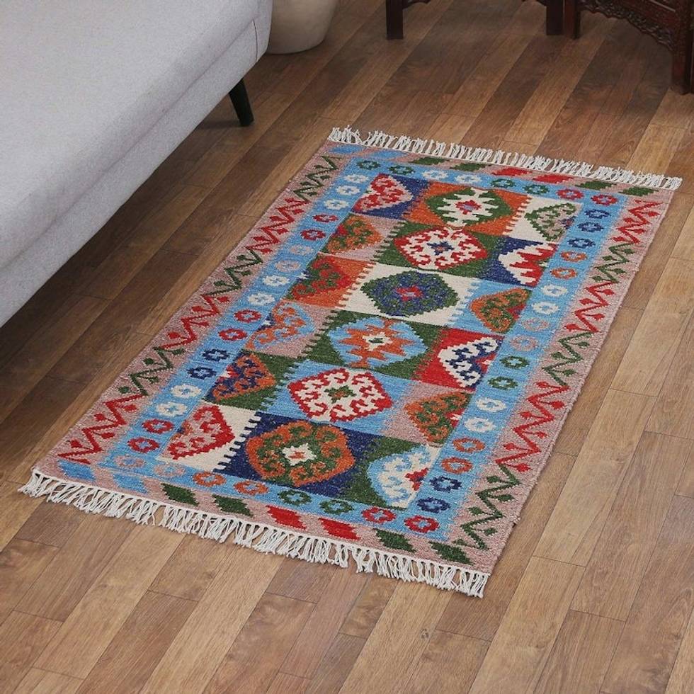 Handloomed Traditional Diamond-Patterned Wool Rug from India 'Creative Blue' Item ID: 2671667341