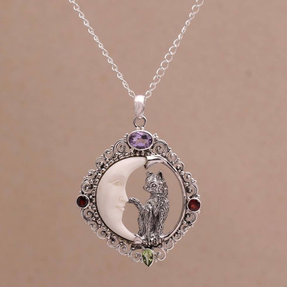 Handmade 925 Sterling Silver Garnet Cat Pendant Necklace 'Kitty's Night' Item ID: 2671821091