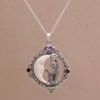 The artist detailed rendering in this necklace has a clear understanding in conveying the nocturnal habits of a good many cats. Dogs do not usually spend their nights out and about but cats on the other hand seem more incline to enjoy bathing in the beams of the our lunar member in the sky. The necklace displays stars of garnet, amethyst and peridot with the cat nestled alongside a portion of the moon which is not yet full but enough so the artist's overall rendering is displayed producing both a dramatic effect and enchantment for "Kitty's Night" Out.