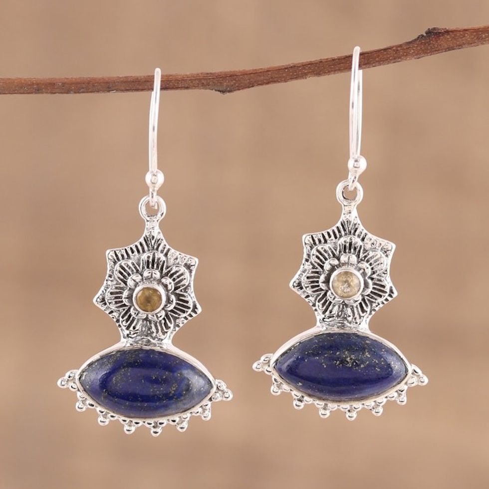 Handmade 925 Sterling Silver Lapis Lazuli Citrine Earrings 'Floral Gaze' Item ID: 2671790446