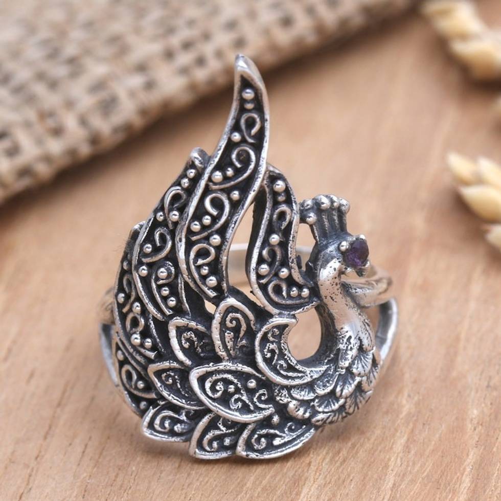 "Engraved with traditional Indonesian designs, Rosalia Tarigan's cocktail ring is a queenly accessory worthy of royalty. Javanese artisans use sterling silver to hand craft the ring, creating feathery patterns in an eye-popping combination finish. Accented with a faceted amethyst jewel, the ring sparkles elegantly."