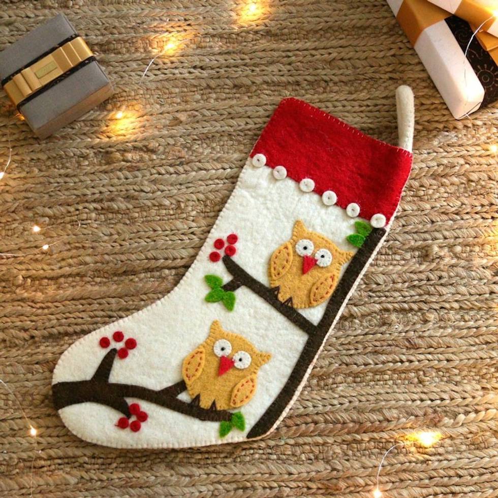 Handmade Applique Wool Felt Owl-Themed Christmas Stocking 'Holiday Magic' Item ID: 2671783247