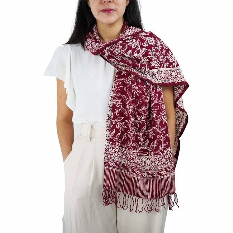 Handmade Batik Scarf, soft Cotton, Red White Cherish, Burgundy Item ID: 2675210521
