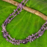 "Gem of spiritual wisdom, amethyst is captivating in this necklace from Thailand. Sukanya Thongperm showcases the beauty of amethyst as she crafts the necklace by hand with beads of different shapes that together become a harmonious whole."