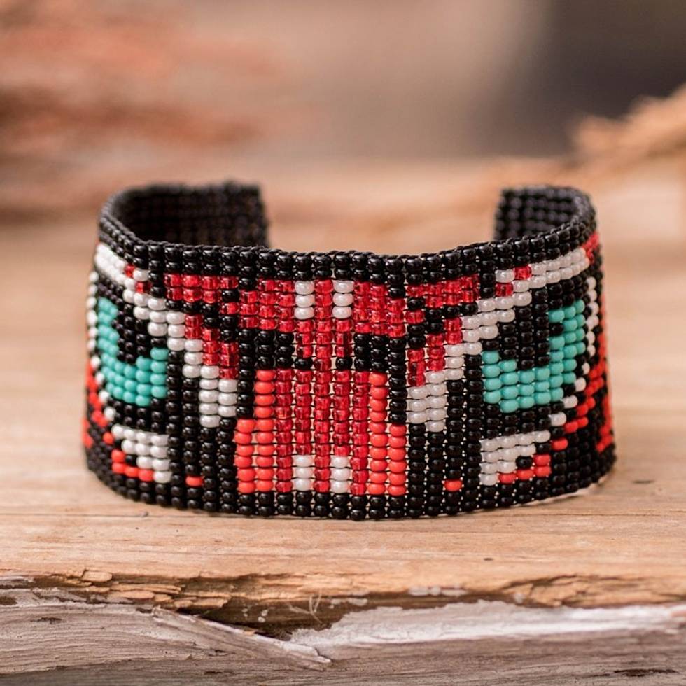 "The Artisans of Panabaj in Guatemala work with small looms to create wonderful beaded accessories like this wristband bracelet. Crafted of tiny glass beads, the wide wristband depicts the steady and forbidding gaze of a tiger. The bracelet can be secured at one of three lengths with a crystal button."