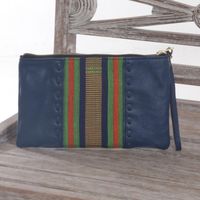"This stylish wristlet bag is hand crafted by Shintamie Suryaputri from Java. The artisan uses a combination of Prussian blue leather and a local handwoven cotton fabric called ikat to create the eye-catching design. Ikat is a traditional Indonesian fabric made using a technique where threads are tie-dyed before being handwoven. The exterior of the bag features a colorful striped pattern in the center flanked by leather, with a strap that slides onto the wrist easily. The wristlet has a zipper closure that opens to a patterned ikat interior with one zippered pocket that is ideal for keeping small items secure."