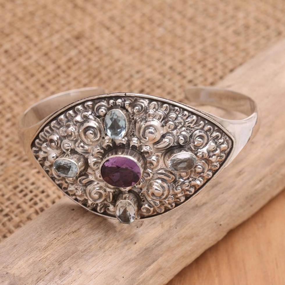 Handmade Blue Topaz and Amethyst Cuff Bracelet 'Elephant Cave in Blue' Item ID: 2671747321