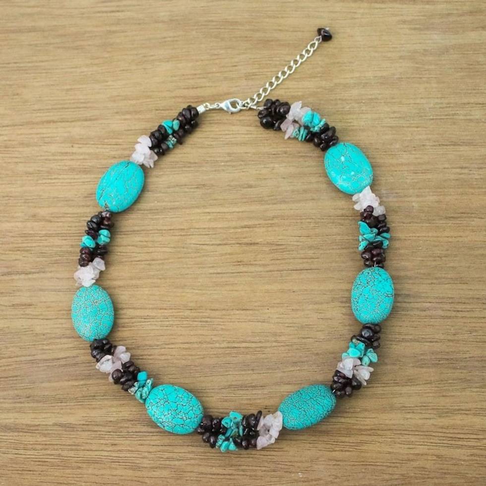 The combination of pearls and garnet is chic, boho, and elegant. I wear it often, it feels good on my neck and receive compliments every time I wear it.
