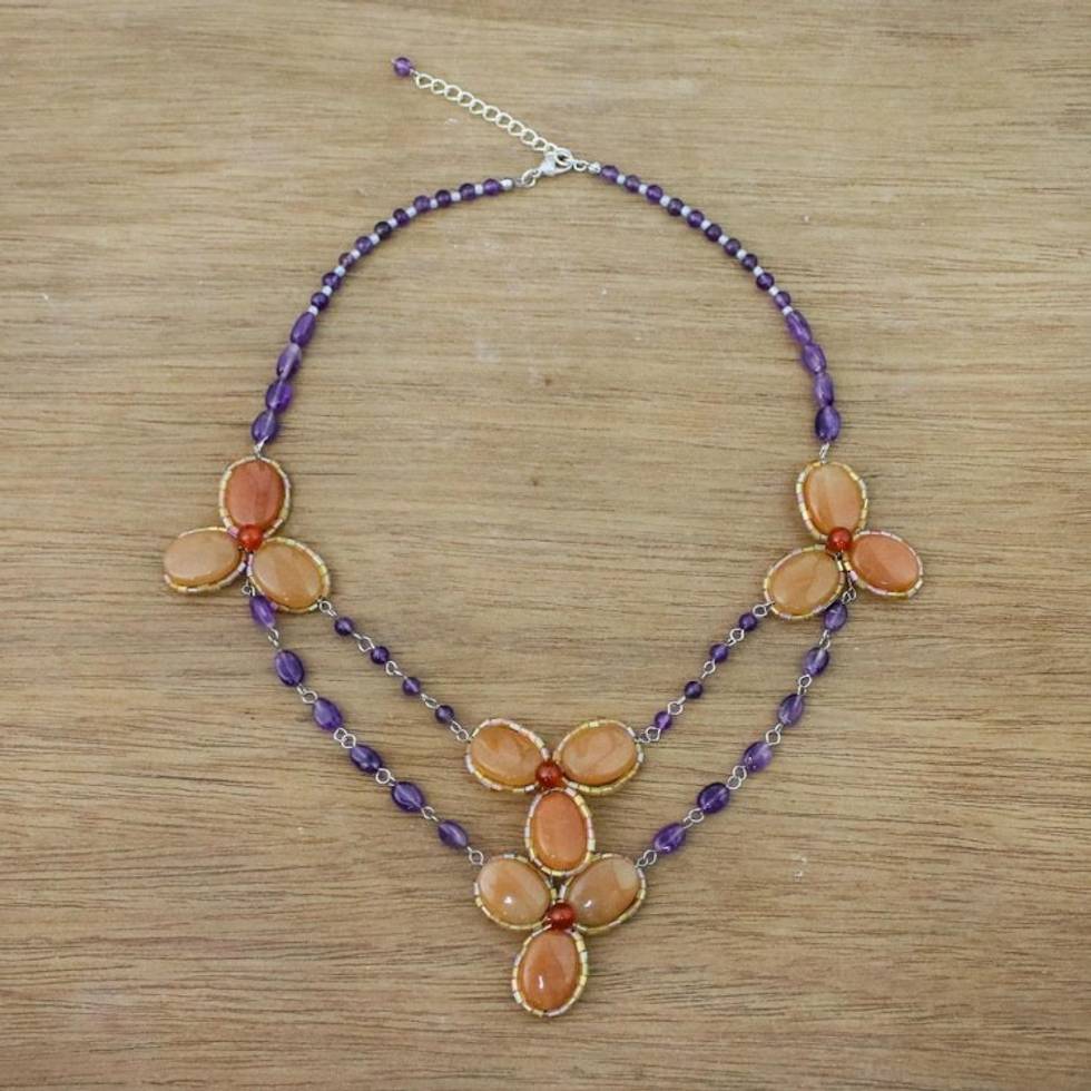 Handmade Carnelian Amethyst Glass Floral Pendant Necklace 'Dawn Bloom in Orange' Item ID: 2669926558