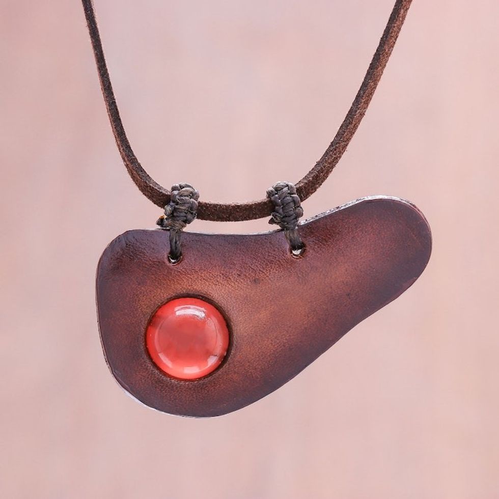 Handmade Carnelian and Leather Pendant Necklace 'Beautiful Avocado' Item ID: 2671798754