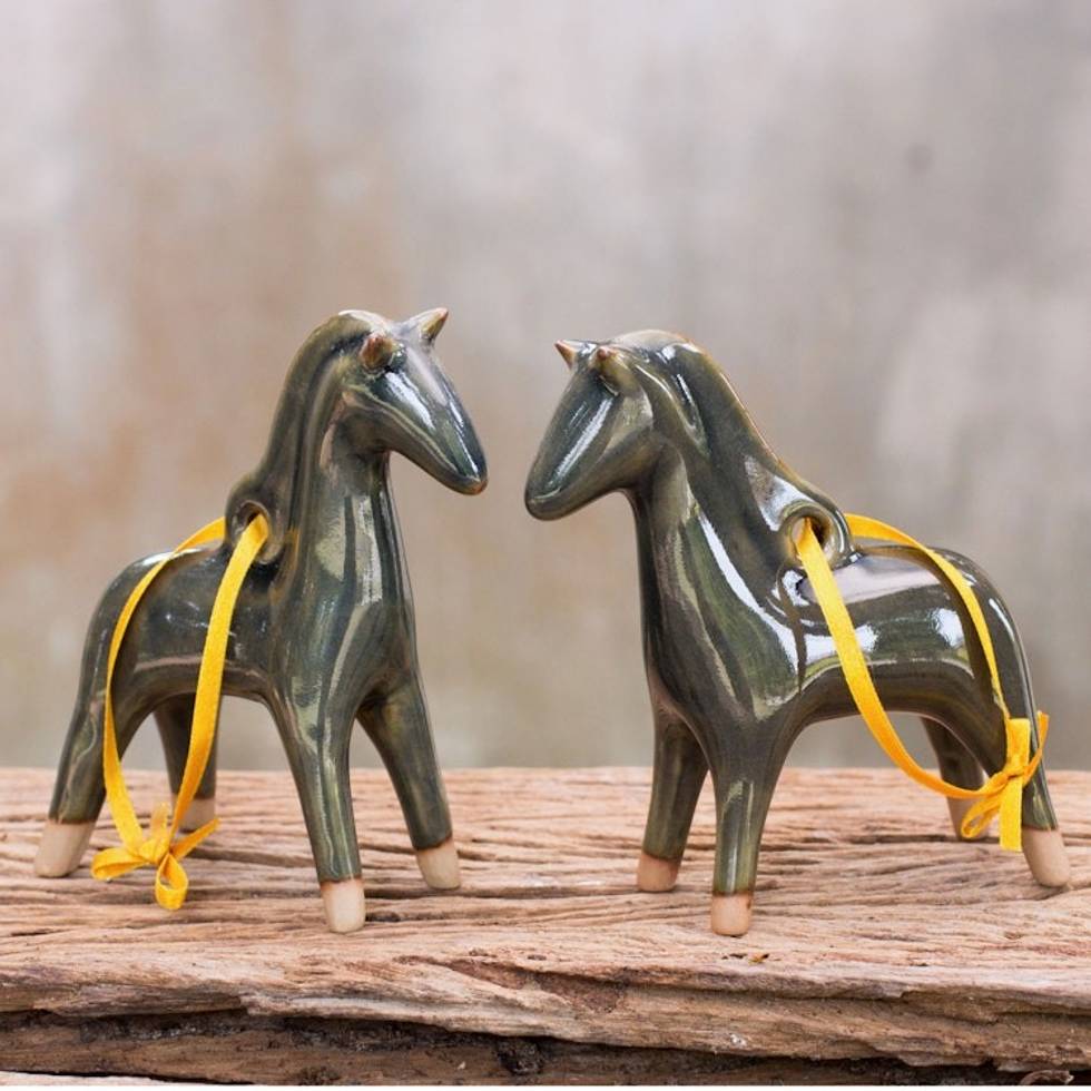Handmade Celadon Ceramic Christmas Ornaments Pair 'Blue Winter Horses' Item ID: 2671641175