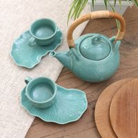 Handmade Ceramic and Bamboo Tea Set for Two 5 Pcs 'Warm Tea in Teal' Item ID: 2671747507