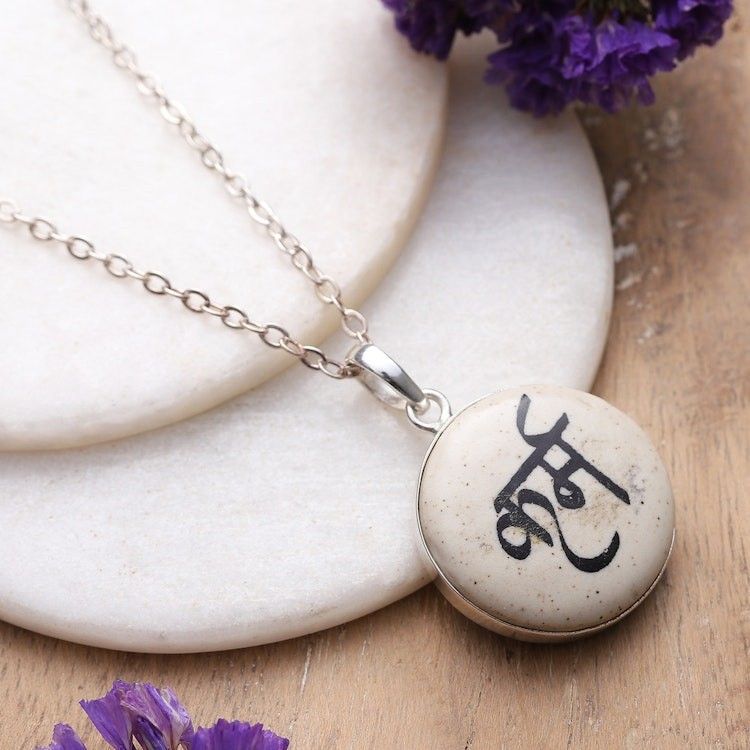 "Karma, written in this piece with sublime Hindi calligraphy, reminds you of the universe's perfect balance, paying good actions with good fortune. Indian artisan Anuva Baid works with master Indian artisans to create this sterling silver necklace, whose ceramic pendant pays exquisite homage to the Hindu doctrine and its wise teachings."