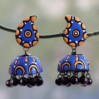 Handmade Ceramic Dangle Earrings in Blue and Orange 'Blue Paisley' Item ID: 2671793074