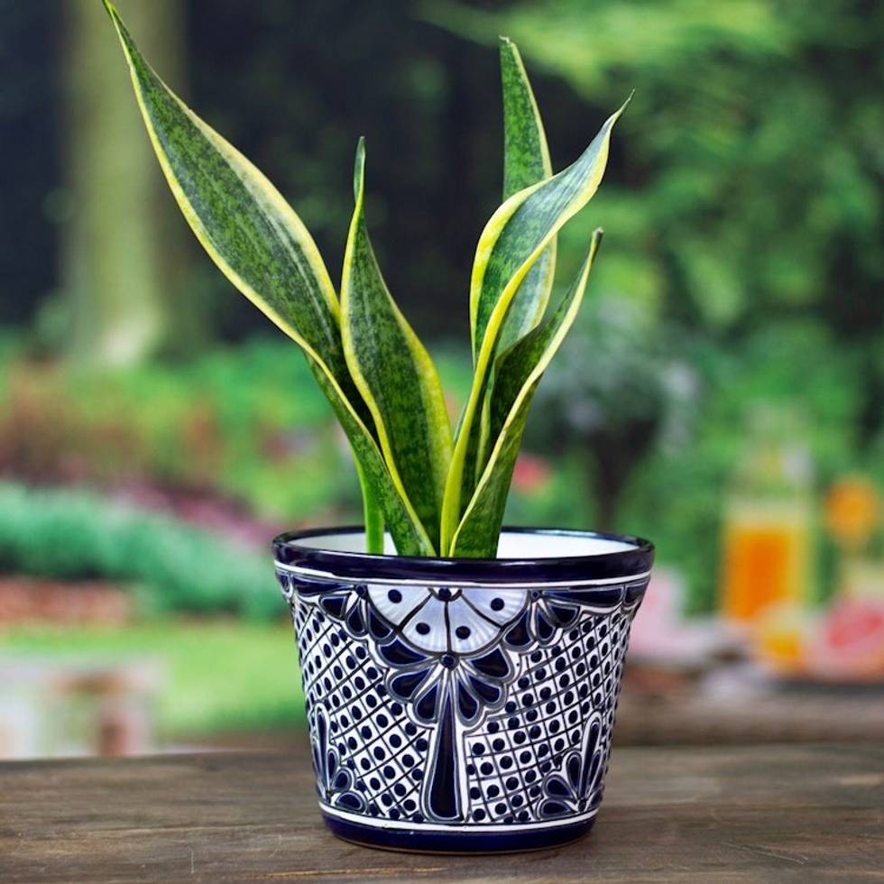 "Made to add charm to those spaces dedicated to nature, Rosa Maria Cardona's newest creation boasts the splendor of Mexico's Hacienda style and high-quality pottery artistry. The artisan uses ceramic and advanced techniques to create this flower pot, adorned with a classic pattern in indigo hues. Equipped with a hole for drainage, the piece comes in a medium size."