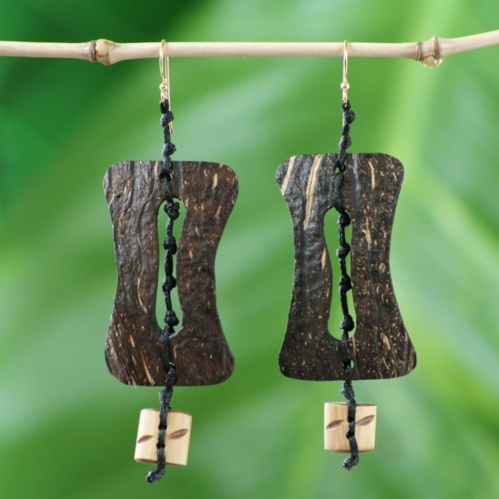 Handmade Coconut Shell Dangle Earrings 'Medieval Nature' Item ID: 2671807081